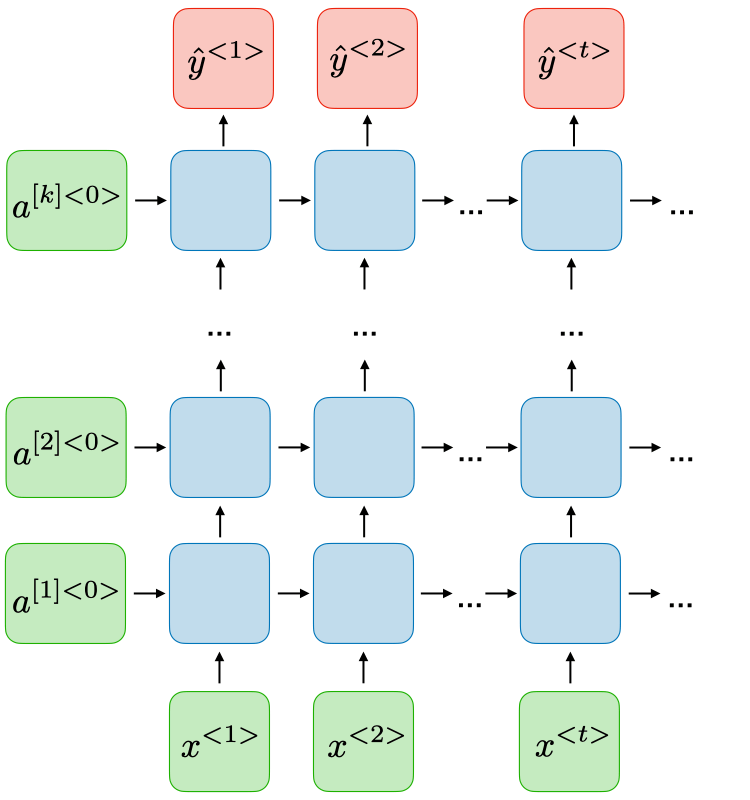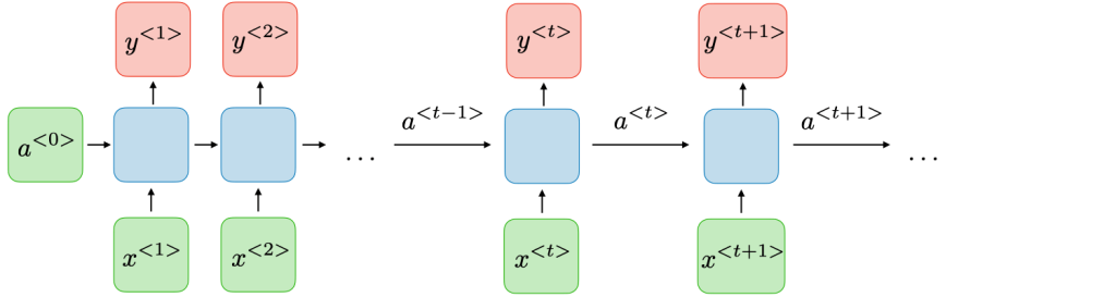 در یک شبکه بازگشتی، در هر لحظه زمانی t، حالت پنهان a( t) از ترکیب حالت پنهان لحظه قبل a( t-1) و ورودی جدید خروجی x( t) تشکیل میشود، و خروجی y(t) از آن استخراج میگردد: