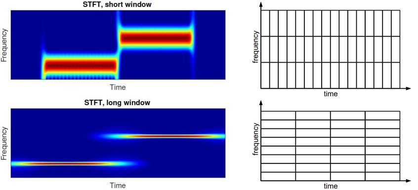 \mathrm{STFT}_x(m, k) = \sum_{n} x[n]\, w[n – m]\, e^{-j 2\pi kn / N}
