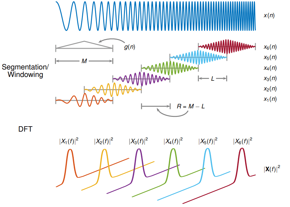 \mathrm{STFT}_x(m, k) = \sum_{n} x[n]\, w[n – m]\, e^{-j 2\pi kn / N}